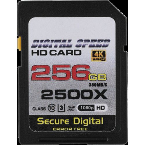 Capture Full HD, 3D, and 4K content with the Digital Speed 2500X 256GB Professional High Speed Mach III 350MB/s Error Free (SDHC) HD Memory Card Class 10 Memory Card. Each of the included SDXC memory card meets the UHS Speed Class 10 specification with maximum data speed of 350 MB/s. While this card is designed to meet the needs of those requiring enhanced data transfer rates, it remains backwards compatible with devices requiring UHS-II, Class 10 memory cards.