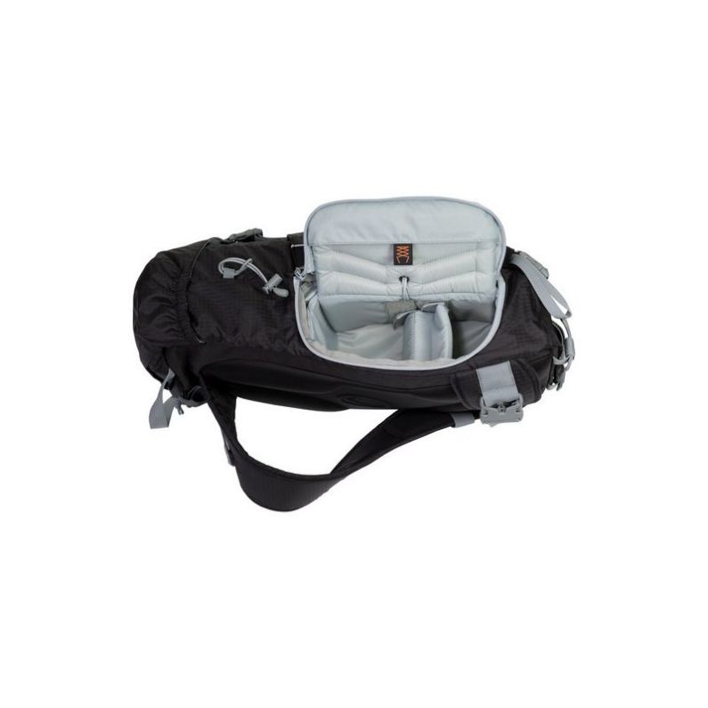 Inside, there is ample space for all kinds of gear and the bag's dual compartment design permits you to organize your contents. The top area is readily accessed and can hold all your small items such as keys or a wallet. The camera bay is for the bulkier items and is accessed two ways - either from the top or side when the pack is rotated for sling use. The zippered and padded side access features Lowepro's Ultra-Cinch Camera Chamber where you'll have a simple and reliable cinch closure in addition to the zipper. Ski poles and walking sticks can easily be affixed to the outside of the bag.